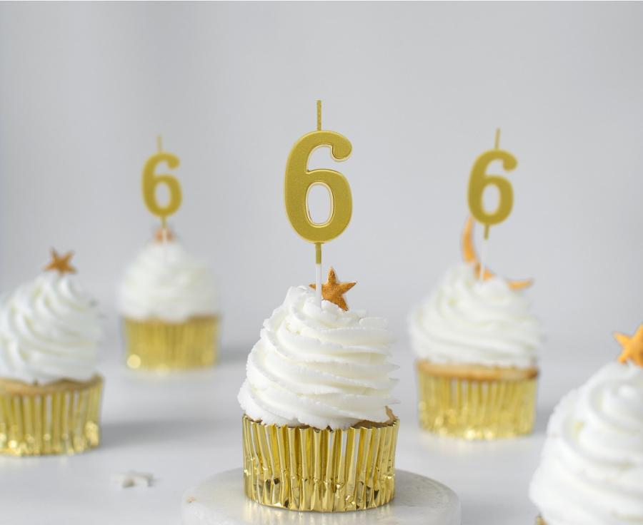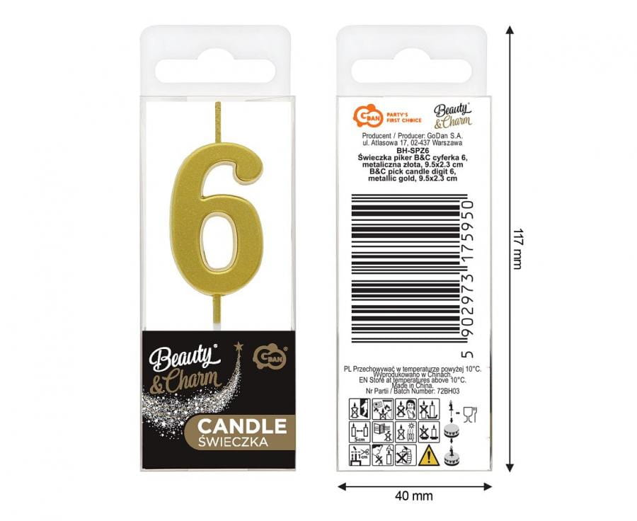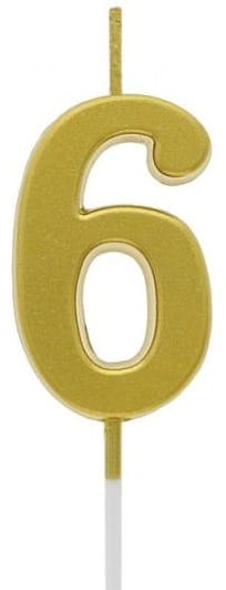 Dodaj elegancji i blasku swojej uroczystości dzięki metalicznej złotej świeczce w kształcie cyfry "6"! To idealna dekoracja na tort urodzinowy, jubileuszowy czy rocznicowy. Może być używana samodzielnie lub jako część większej liczby, np. "60"
