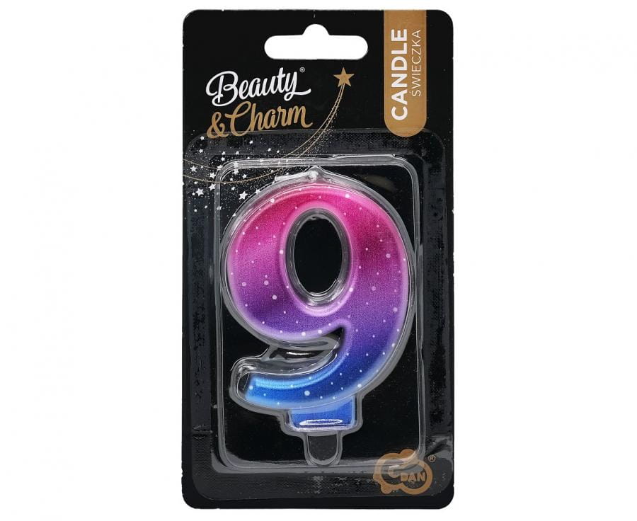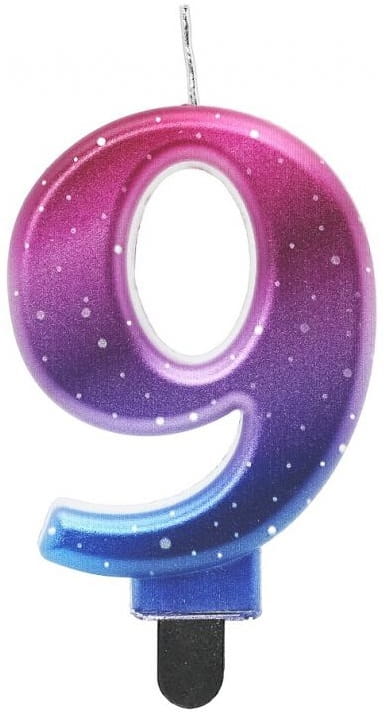 Świeczka urodzinowa to konieczna ozdoba każdego tortu. Prezentowana świeczka w kolorze ombre różowo-fioletowym z nadrukiem delikatnych gwiazdek przypomina wyglądem nocne niebo, latego będzie idealną dekoracją na torcie np. dla miłośników Kosmosu. Świeczka jest w kształcie cyfry, więc idealnie sprawdzi się do tworzenia różnego rodzaju dat.
