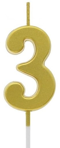 Dodaj elegancji i blasku swojej uroczystości dzięki metalicznej złotej świeczce w kształcie cyfry "3"! To idealna dekoracja na tort urodzinowy, jubileuszowy czy rocznicowy. Może być używana samodzielnie lub jako część większej liczby, np. "30"