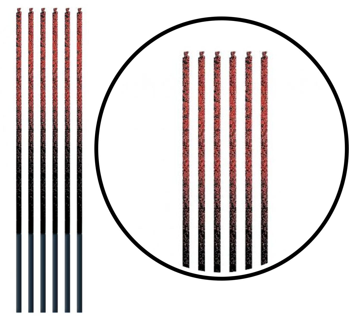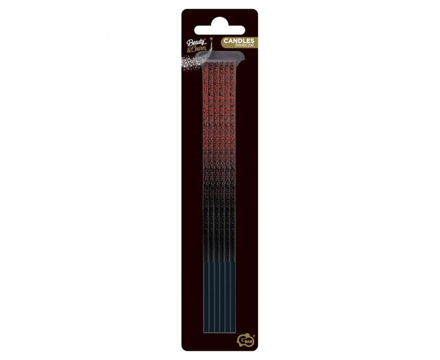 Świeczki to konieczny element urodzinowego tortu, a ich zdmuchanie na torcie to już tradycja. Ten komplet sześciu długich świeczek będzie wspaniałą ozdobą urodzinowego tortu. Dodatkowo ich czarny kolor pokryty czerwonym brokatem sprawi, że umieszczone na torcie będą jego elegancką dekoracją.