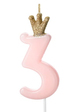 Urodzinowa świeczka na tort o ciekawym kształcie cyfry 3 w koronie! Różowy kolor cyferki oraz brokatowa korona będą świetnym uzupełnieniem, bez wątpienia już i tak wspaniałego tortu dla naszego solenizanta.