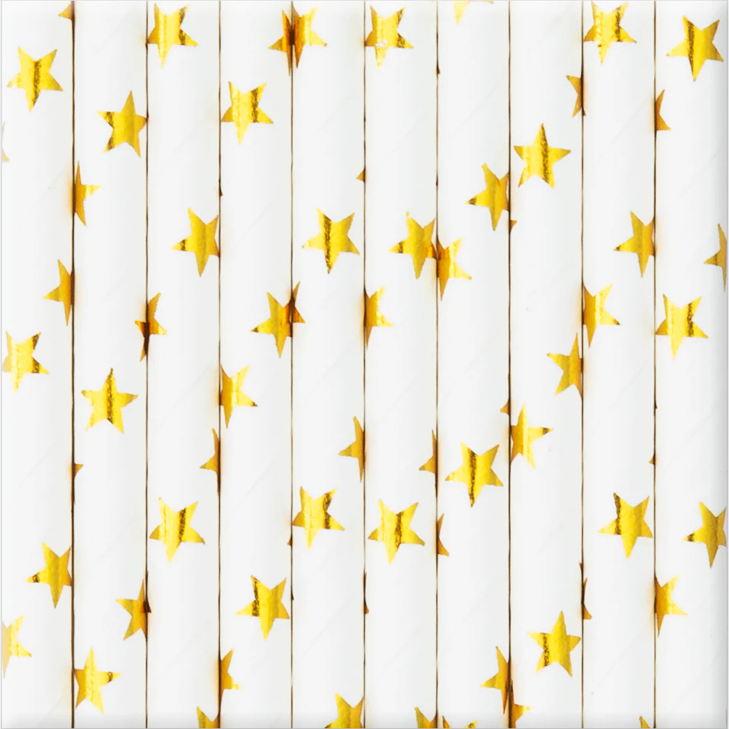 Papierowe słomki w kolorze białym ze złotymi gwiazdkami - poza praktycznym rozwiązaniem, jako słomki do picia napojów, idealnie sprawdzą się również jako słomki do cake popsów, lizaków z bez. Prezentują się niezwykle elegancko, dzięki czemu Twój słodki stół będzie wspaniale ozdobiony. Wykonane z papieru, więc są w pełnie biodegradowalne i ekologiczne.
