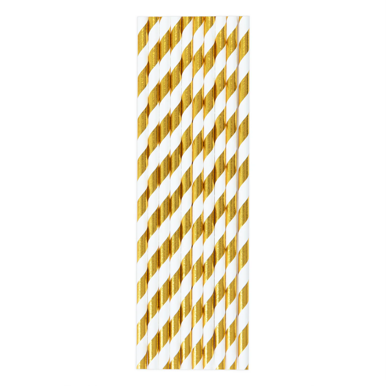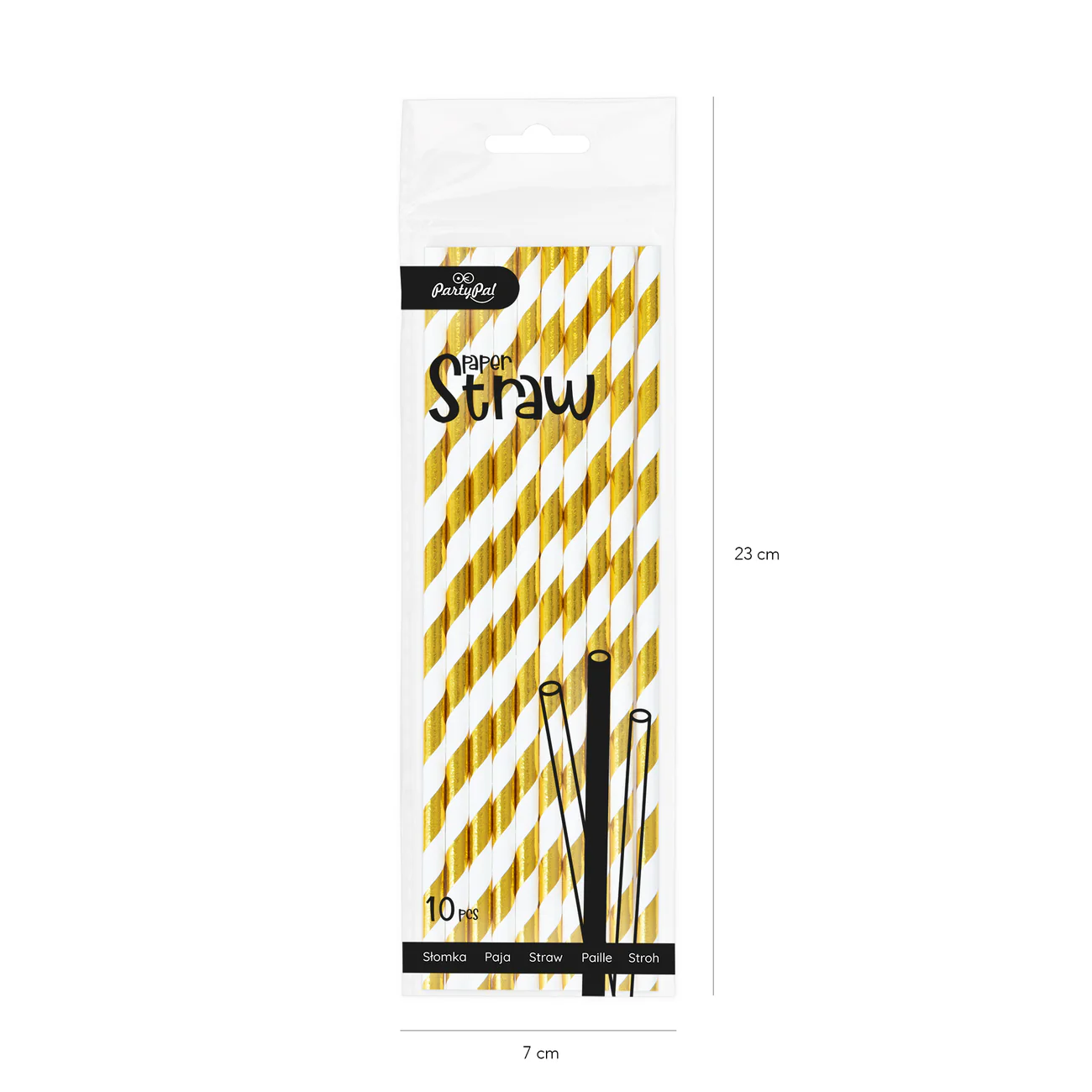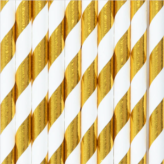 Papierowe słomki w kolorze białym ze złotymi paskami - poza praktycznym rozwiązaniem, jako słomki do picia napojów, idealnie sprawdzą się również jako słomki do cake popsów, lizaków z bez. Prezentują się niezwykle elegancko, dzięki czemu Twój słodki stół będzie wspaniale ozdobiony. Wykonane z papieru, więc są w pełnie biodegradowalne i ekologiczne.