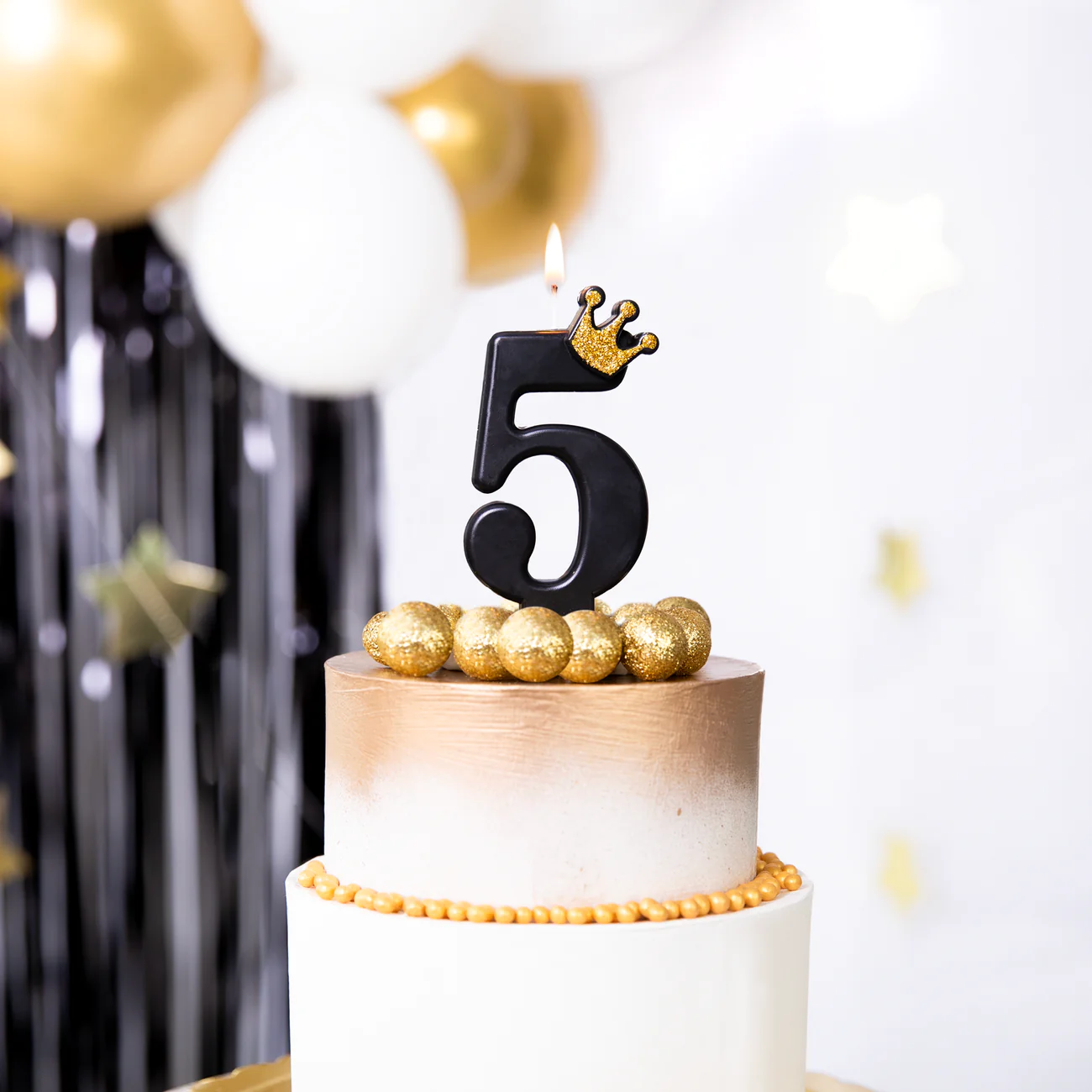 PartyPal Świeczka czarna ze złotą koroną cyfra 5