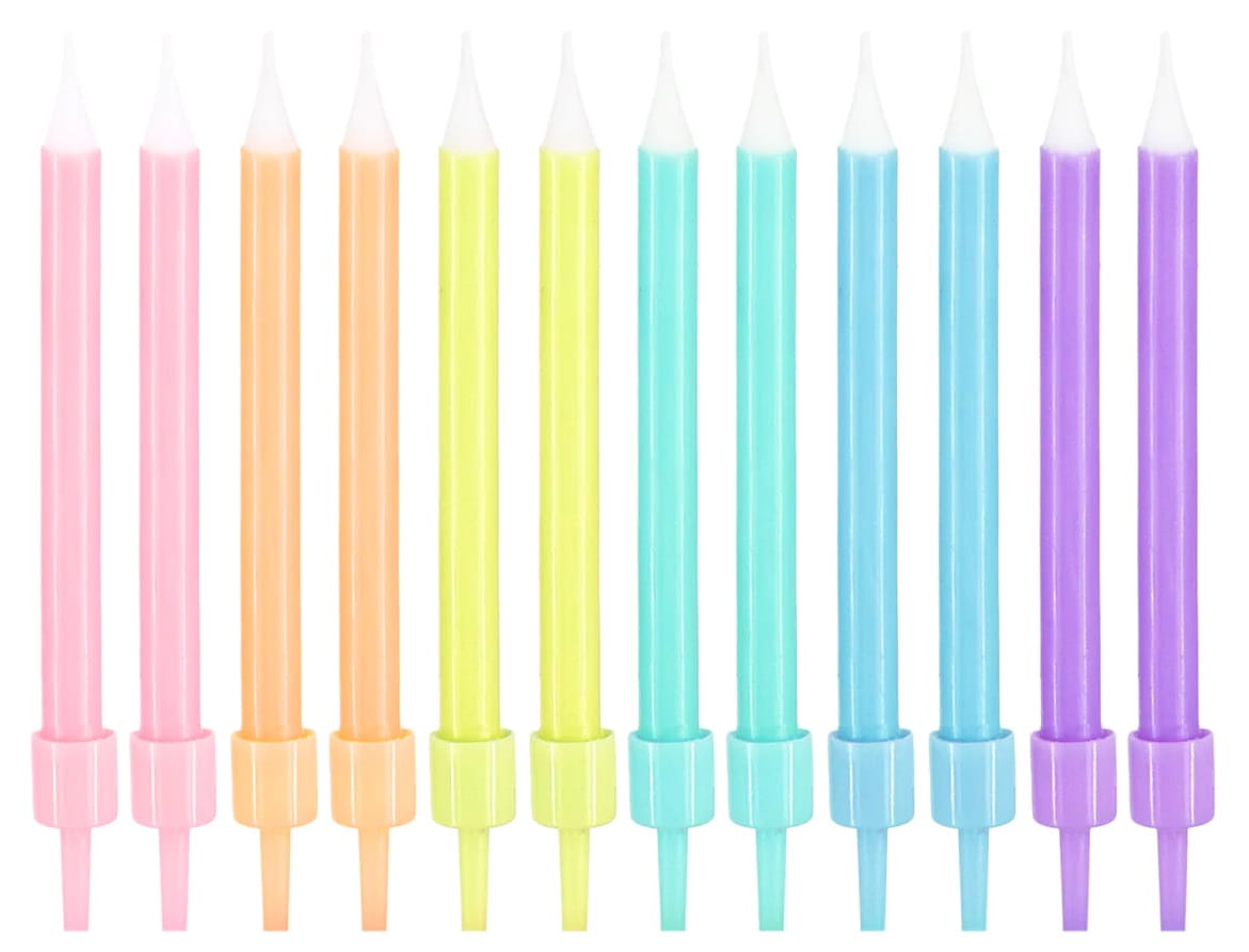 Świeczki to konieczny element urodzinowego tortu, a ich zdmuchanie na torcie to już tradycja. Ten komplet dwunastu świeczek będzie wspaniałą ozdobą urodzinowego tortu. Dodatkowo ich pastelowe kolory sprawią, że umieszczone na torcie będą jego wspaniałą dekoracją. Świeczki posiadają podstawki, dzięki czemu łatwo i stabilnie umieścisz ją na torcie.