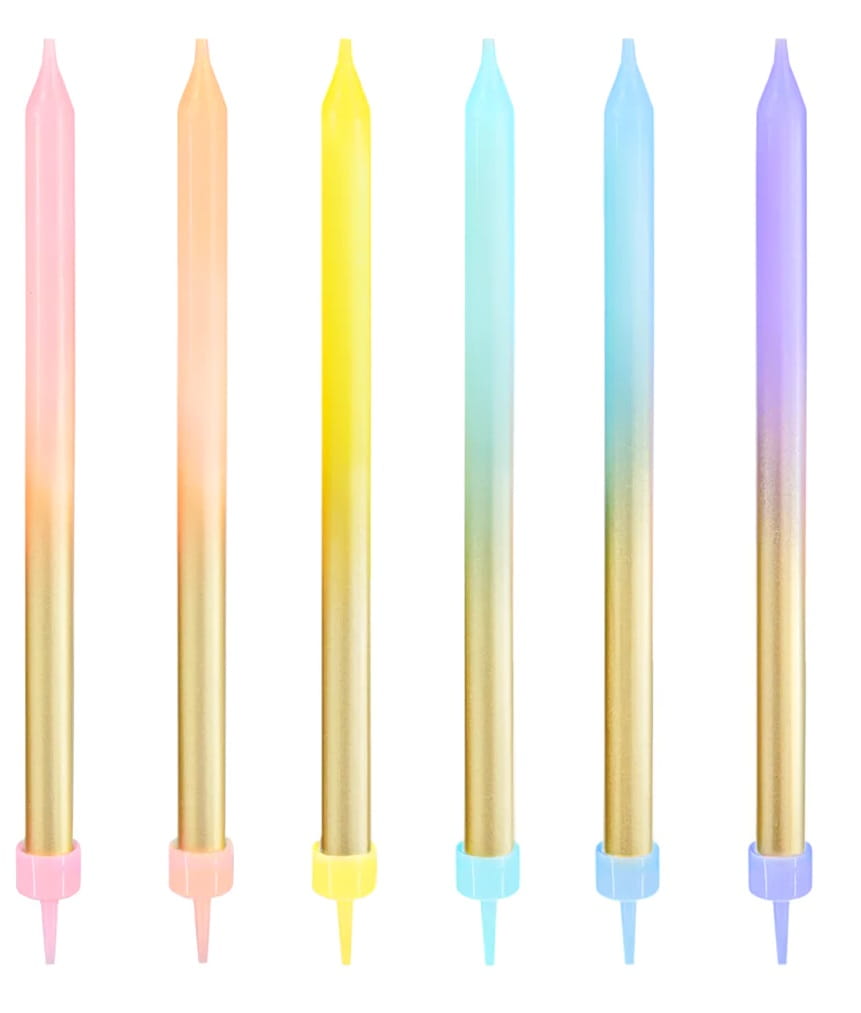 Świeczki to konieczny element urodzinowego tortu, a ich zdmuchanie na torcie to już tradycja. Ten komplet długich tęczowych świeczek będzie wspaniałą ozdobą urodzinowego tortu. Dodatkowo świeczki częsciowo pokryte są złotym kolorem, więc umieszczone na torcie będą jego wspaniałą dekoracją.